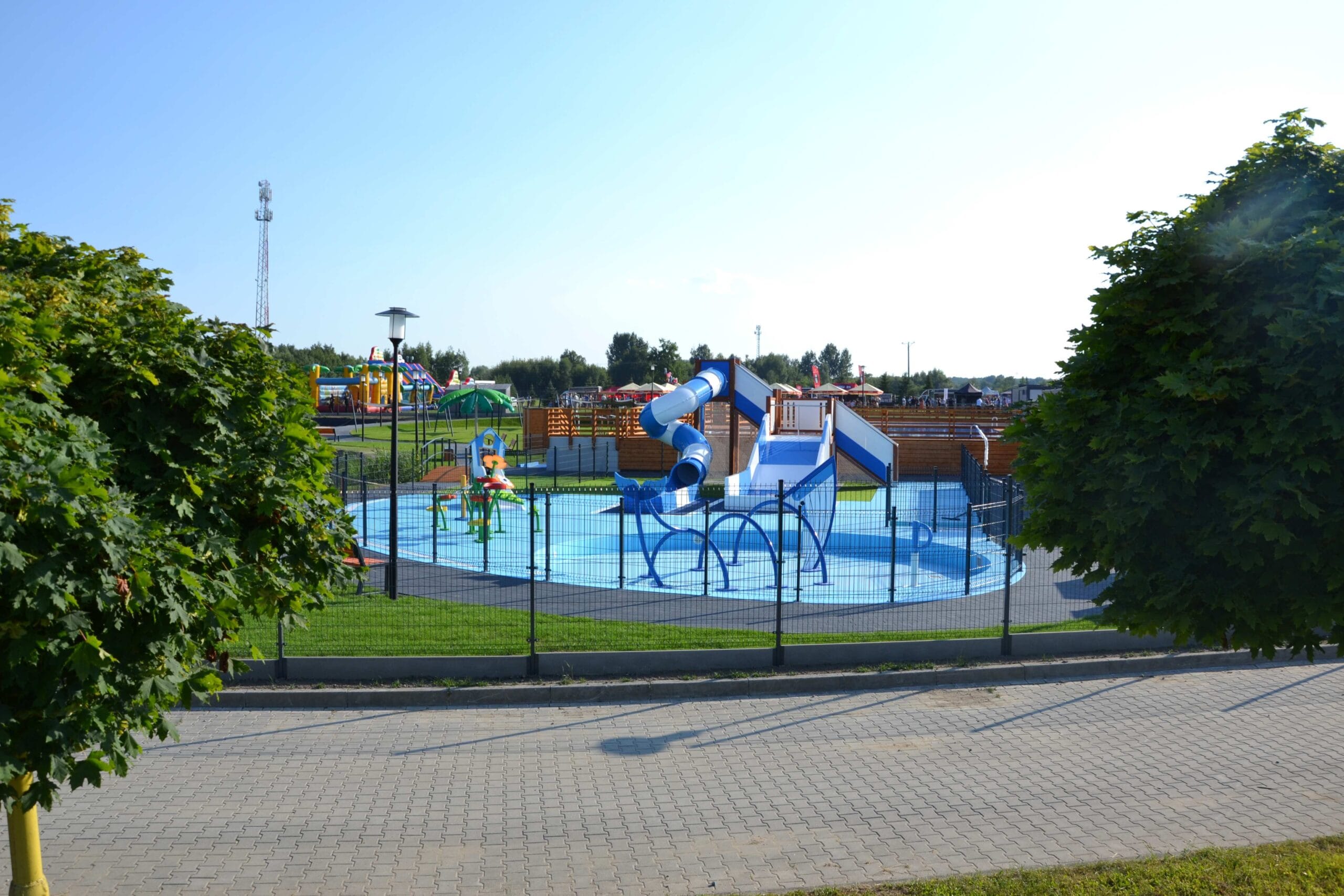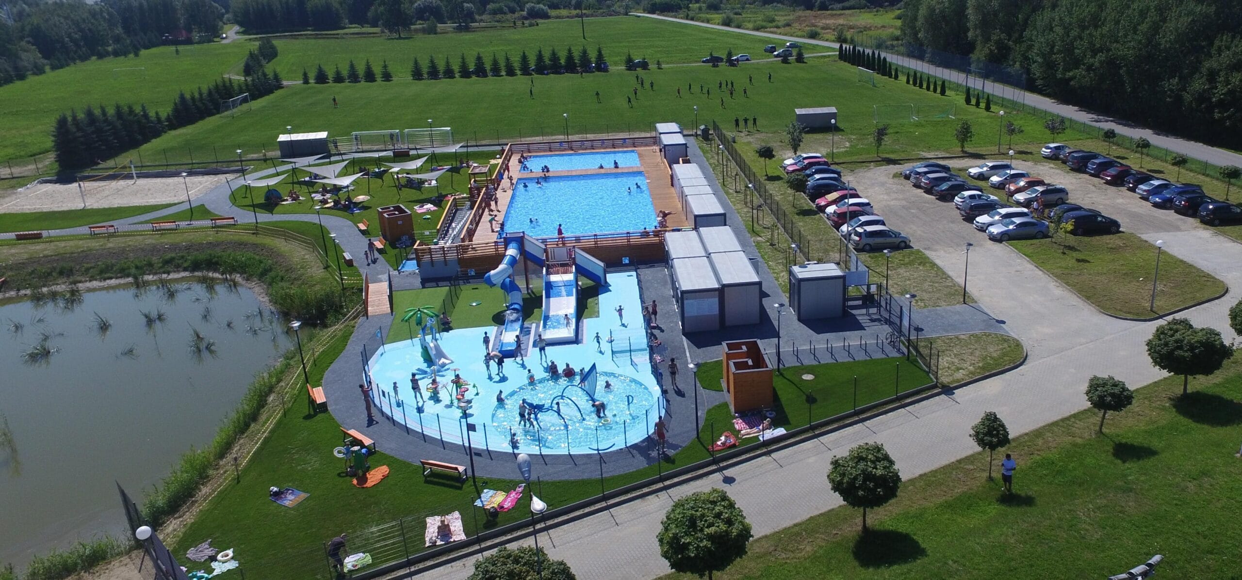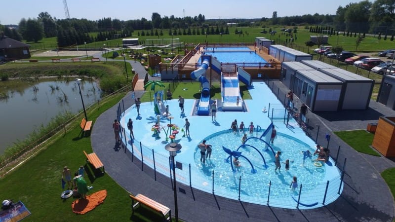 Przedmiotem zamówienia była budowa 2 basenów stelażowych zewnętrznych letnich, wodny plac zabaw (splash park i brodzik), zjeżdżalnie wodne, budynki kontenerowe kas z zapleczem, budynek ratownika z zapleczem, dwa budynki kontenerowe sanitarne – w tym dostępne dla os. niepełnosprawnych, budynki technologiczne i magazynowe, konstrukcje pomostowe drewniane, niezbędną infrastrukturę – schody terenowe, chodniki, murki oporowe, oświetlenie terenowe, oraz małą architekturą – prysznice plenerowe, ławki, plenerowe kabiny do przebierania, zadaszenia, żagle zacieniające, stojaki na rowery, kosze na odpady.