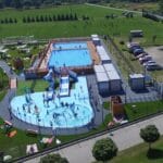 - basen rekreacyjny o wymiarach ok. 25 x 12,5 m ze stałą głębokością wody 1,20 m i basen rekreacyjny ok. 8 x16 m ze stałą głębokością wody 0,55 m, wykonane w technologii basenowych niecek napowierzchniowych;